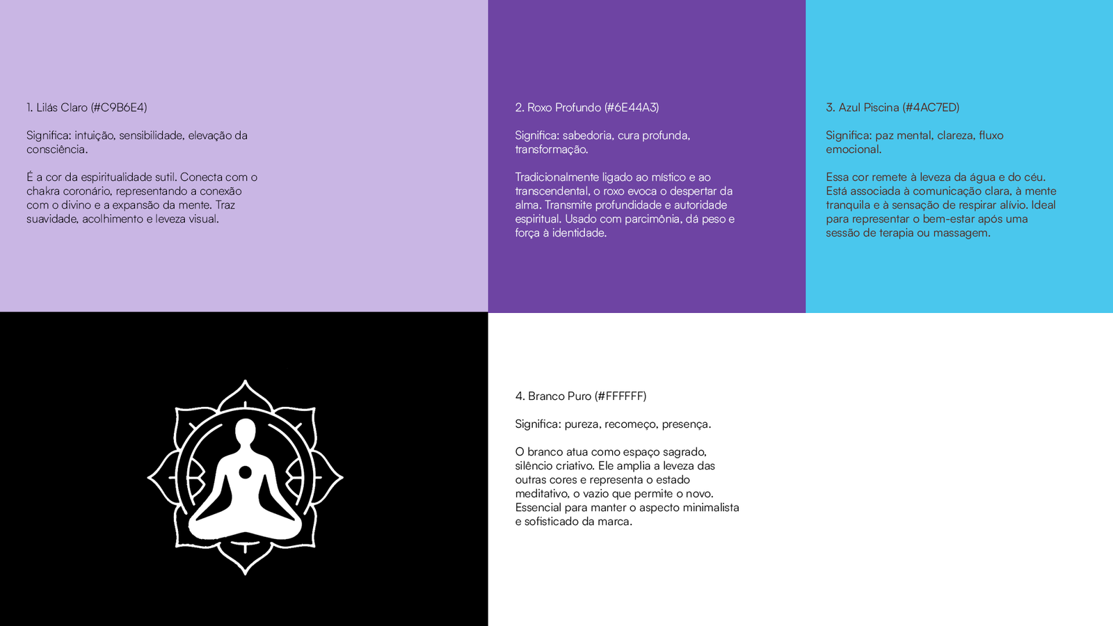 Paleta de Cura: Lilás Claro (#C9B6E4), Roxo Profundo (#6E44A3) e Azul Piscina (#4AC7ED).